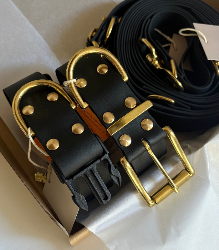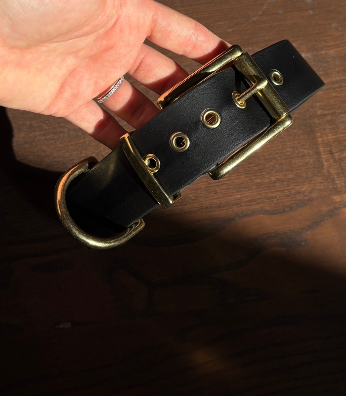 Obroża dla dużego psa została wykonana z opatentowanej w Stanach Zjednoczonych, mocnej taśmy wodoodpornej BioThane®. Jest to wegański odpowiednik skóry, którą przypomina wyglądem i strukturą. Materiał jest miękki i elastyczny. Mosiężne okucia i mocne śruby sprawiają, że to idealna propozycja dla dużych i slinych psów. Akcesoria wykonane z tego materiału są niezwykle trwałe, odporne na zapachy i łatwe w czyszczeniu po to, aby Twój pies mógł pływać, bawić się w błocie lub spacerować po mieście w wielkim stylu. ♥
