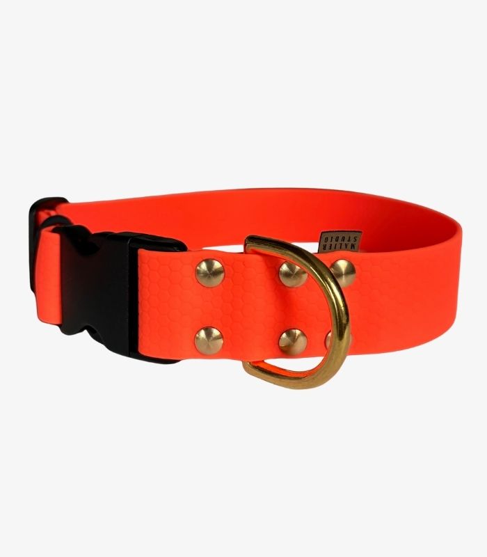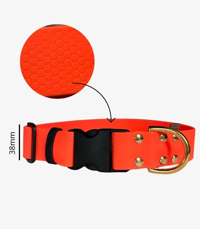Obroża dla dużego psa została wykonana z  taśmy HEXA. Materiał jest miękki i elastyczny. Mosiężne okucia i mocne śruby sprawiają, że to idealna propozycja dla dużych i silnych psów. Akcesoria wykonane z tego materiału są niezwykle trwałe, odporne na zapachy i łatwe w czyszczeniu po to, aby Twój pies mógł pływać, bawić się w błocie lub spacerować po mieście w wielkim stylu.  ♥