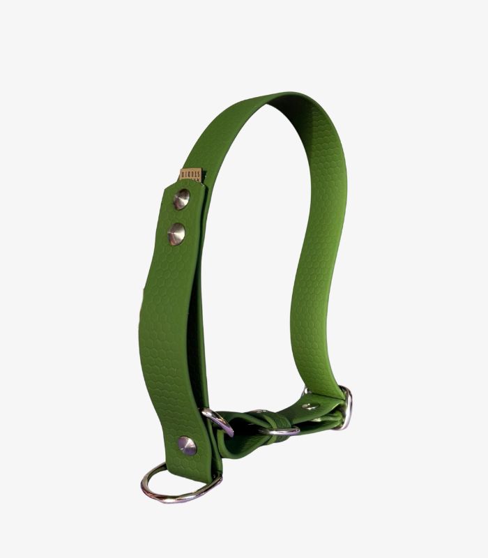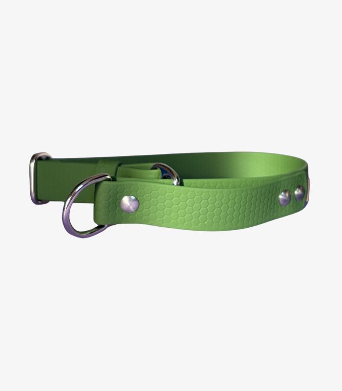 Obroża półzaciskowa została wykonana z wodoodpornej taśmy Hexa ze wzorem plastra miodu. Obroża zaciska się, kiedy pies ciągnie lub próbuje się z niej wydostać dzięki delikatnemu zmniejszaniu obwodu do ustawionego na obroży momentu.