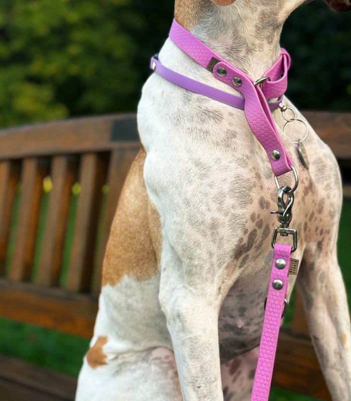 Obroża półzaciskowa została wykonana z wodoodpornej taśmy Hexa ze wzorem plastra miodu.  Obroża zaciska się, kiedy pies ciągnie lub próbuje się z niej wydostać dzięki delikatnemu zmniejszaniu obwodu do ustawionego na obroży momentu.