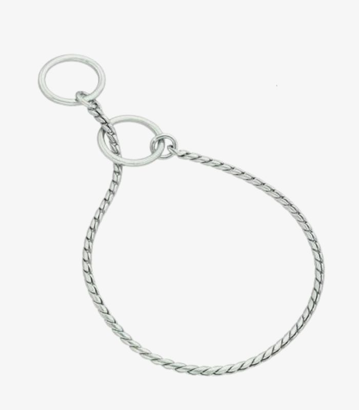 Obroża pokazowa wykonana z modnego łańcucha wężykowego zakończona spawanymi pierścieniami przeznaczona do prowadzenia psa na ringu. Nie mierzwi sierści czworonoga, a zastosowany splot nie powoduje wyrywania włosów.