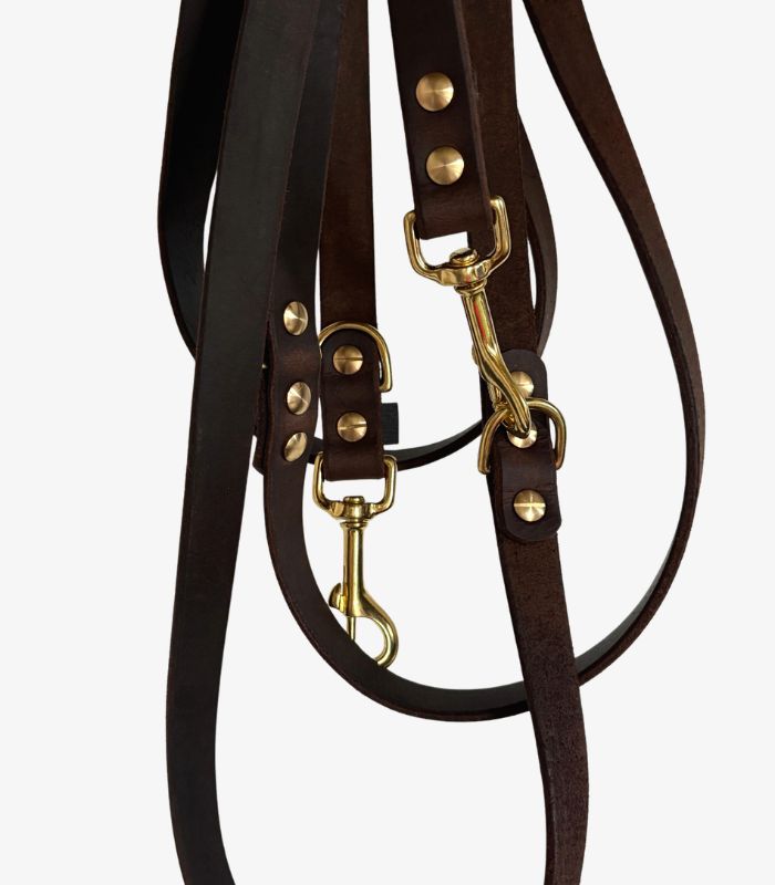 Dzięki regulowanej długości smycz można łatwo dopasować do swoich potrzeb – sprawdzi się zarówno podczas miejskich spacerów, jak i dłuższych wędrówek. Solidne okucia zapewniają bezpieczeństwo, a staranne wykończenie podkreśla jej unikalny, rzemieślniczy charakter.