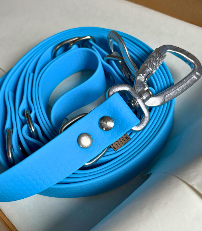Smycz przepinana została wykonana z wodoodpornej, miękkiej taśmy typu Hexa. Taśma hexa ma po obu stronach wzór plastra miodu (sześciokąta) i jest pokryta PVC/TPU. Smycz przepinana posiada możliwość regulacji na trzy różne długości poprzez przepięcie karabinka na preferowaną długość. Smycz można nosić w pasie i przerzucić przez ramię, aby mieć wolne ręce oraz skrócić o połowę.